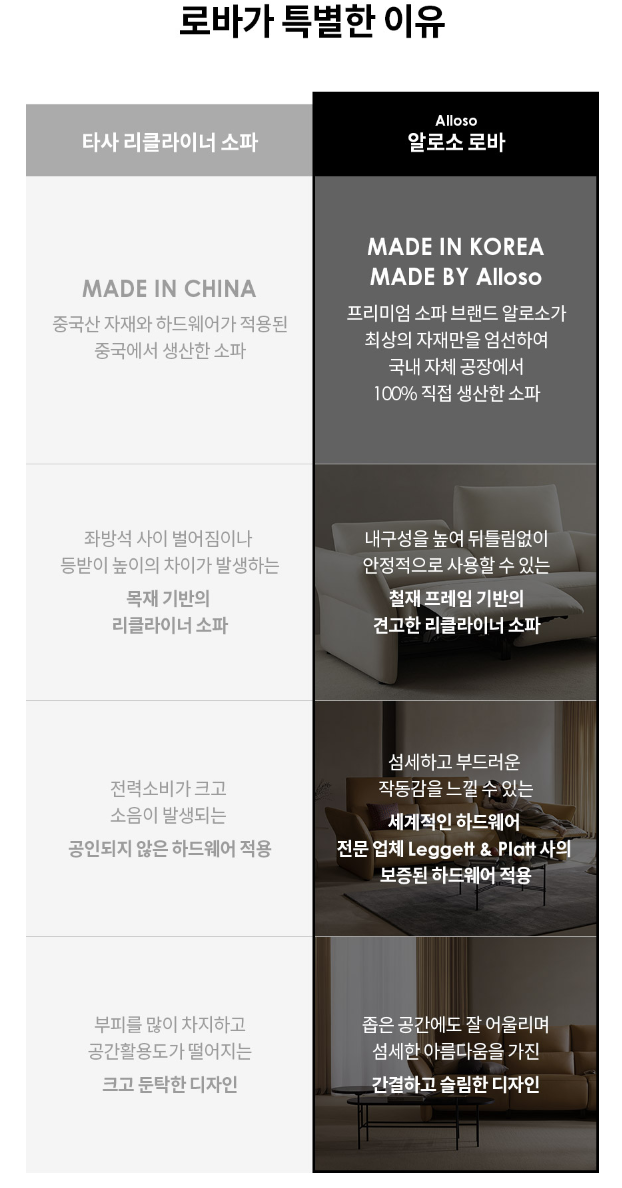 1. 시중 리클라이너는 대부분 중국산 자재와 하드웨어가 적용된 중국 생산 소파이지만, 알로소의 로바는 최상의 자재를 선별하여 국내 공장에서 생산한 소파