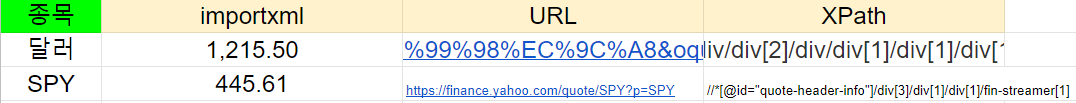 importxml(URL, XPath) 이렇게 입력했더니 1,215.50 원이 출력되는 것을 알 수 있죠???