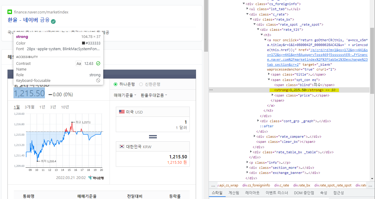 환율 1,1215.50에 커서를 가져가면 이렇게 <strong>1,215.50</strong> 문자열을 확인 할 수 있는데요.